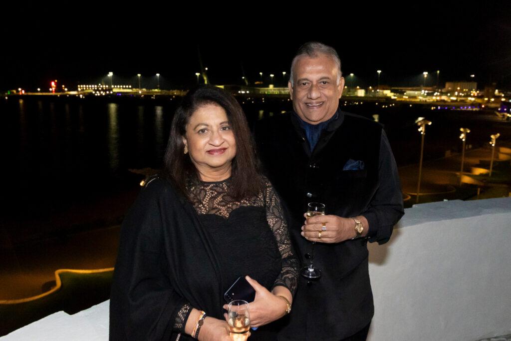 The photograph shows the ambassador and his wife Deepthi on the balcony during the launch event, with the lights of the harbour behind them.